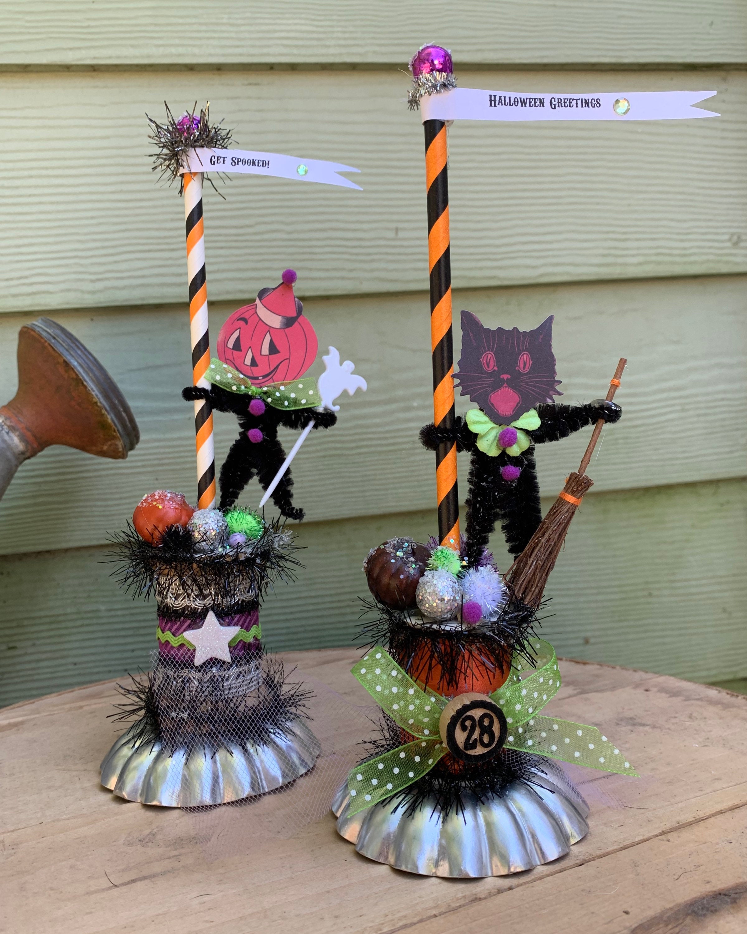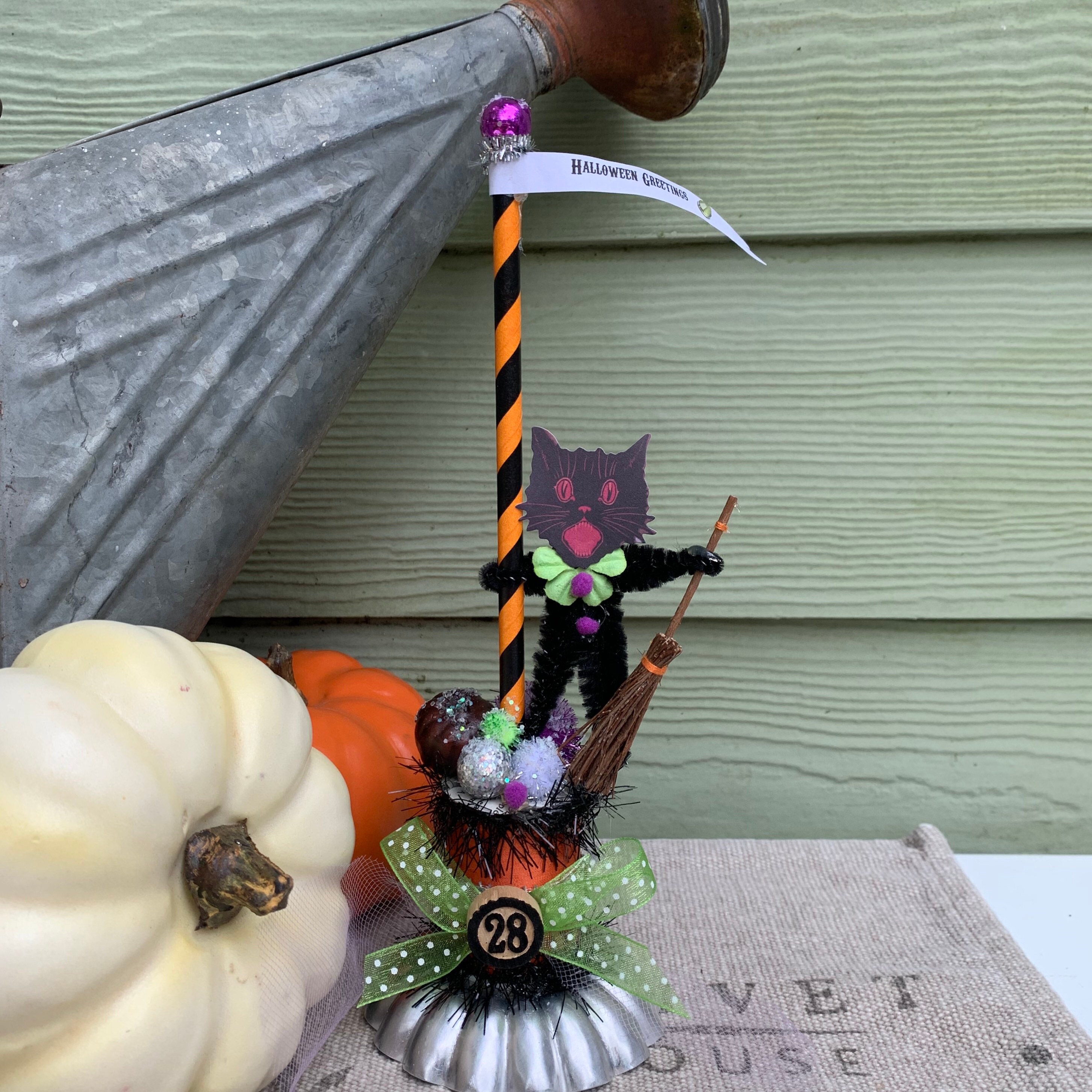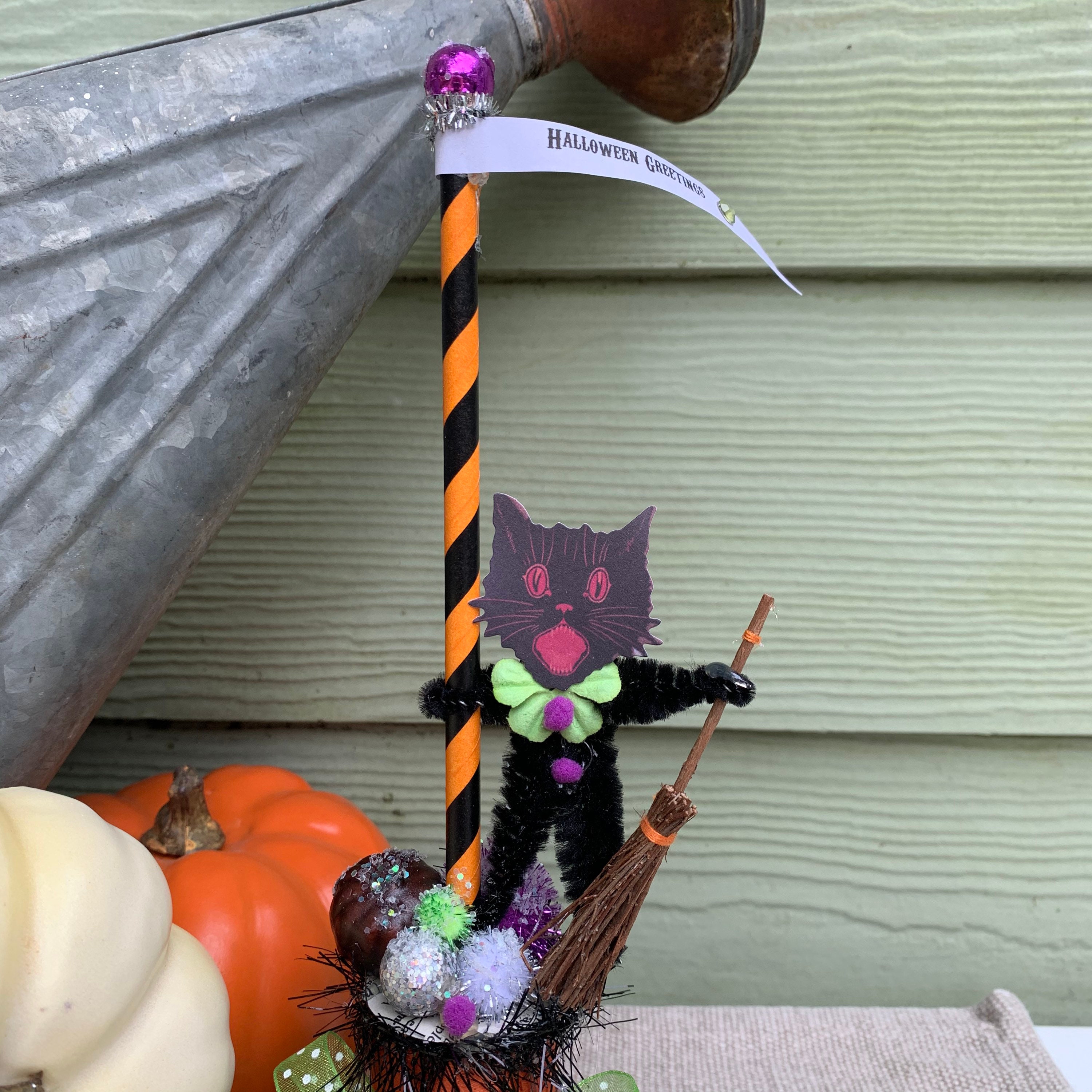 This sweet vintage-inspired pipe cleaner Halloween black cat is ready to join your Halloween celebration! He's perched on top of a vintage spool embellished with black vintage style tinsel, miniature pom-poms, millinery flowers and ribbon. He swings from a orange and black striped straw "pole" with a banner that reads "Halloween Greetings". In his hands is a broom. He would be perfect for your mantel or desk!